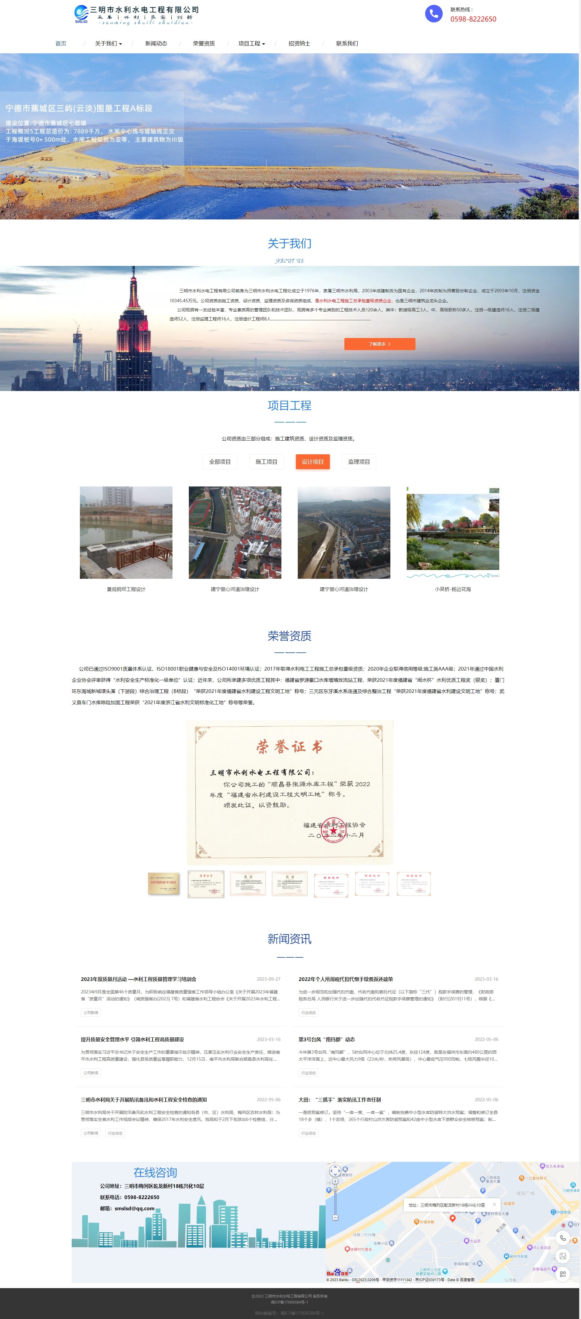 公司具备施工、设计、监理等多项资质,其中施工资质具备:水利水电施工总承包壹级,建筑工程施工总承包叁级、市政公用工程施工总承包叁级、公路工程施工总承包叁级、电力工程施工总承包叁级、港口与海岸工程专业承包叁级、地基基础工程专业承包叁级、通航建筑物工程专业承包叁级、输变电工程专业承包叁级;设计资质具备:工程设计水利行业丙级、工程勘察专业类(岩土工程(勘察)、工程测量)丙级、水文、水资源调查评价乙级、水资源论证乙级。监理资质具备:水利监理乙级。